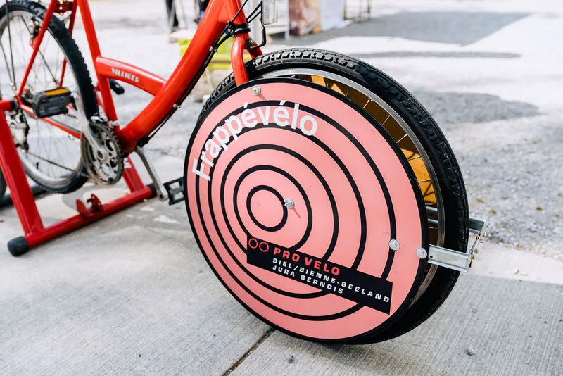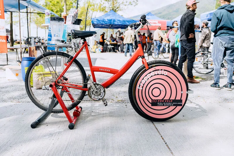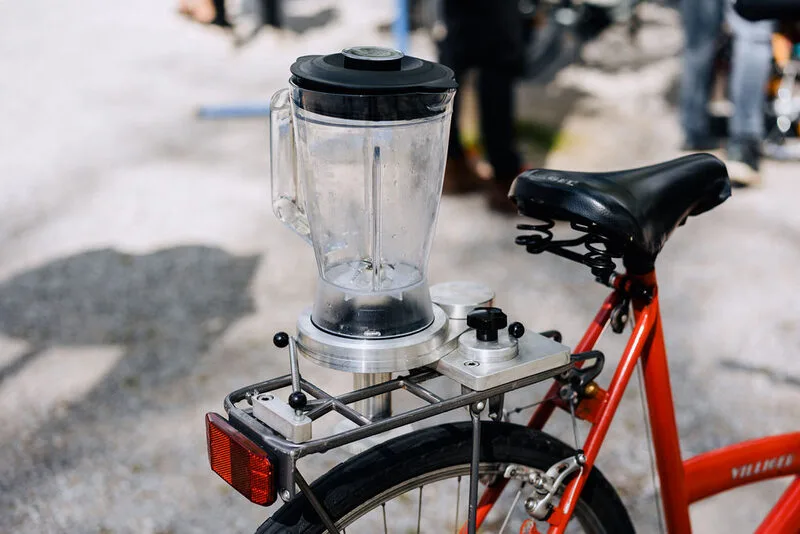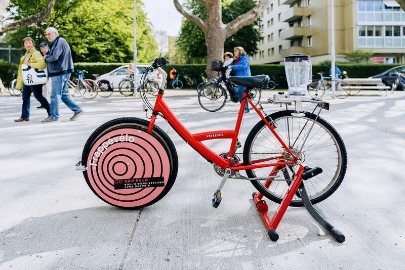 Ein ausgeklügelter Mechanismus überträgt die Kraft vom Hinterrad in den Mixer. Bereits ein paar Pedalumdrehungen genügen um die Sache ins Laufen zu bringen. Das bringt Schwung und sorgt für gute Stimmung. PRO VELO Biel/Bienne-Seeland-Jura bernois hat vier Frappévélos im Angebot, welche sie für Ihr Familienfest oder einen anderen Anlass mieten können. Hier könnt Ihr den Flyer anschauen und für mehr Informationen oder eine Reservation wenden Sie sich bitte an sekretariat(at)pro-velo-biel.ch